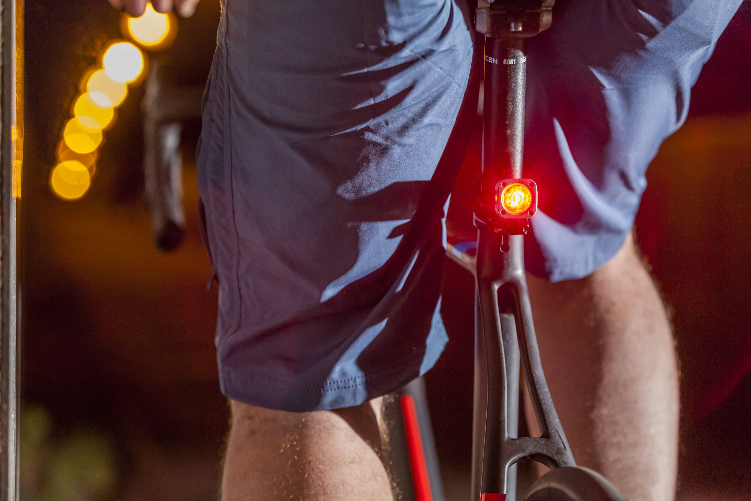 Rear view of a cyclist wearing blue shorts with a red light on the bicycle seat post at night.